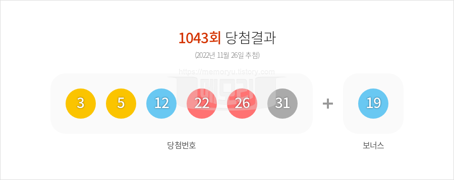 (주)동행복권에서 시행하는 로또 6/45 1043회(2022년 11월 26일 추첨)의 당첨 결과(복권 총 판매액과 등위별 당첨금액, 1등 당첨자 배출 판매점 등)가 나왔습니다. 1043회 로또복권 총 판매액은 107,045,942,000원입니다. 행운의 로또 1등 당첨 번호는 3, 5, 12, 22, 26, 31 입니다. 2등 보너스 번호는 19입니다. 당첨 되신 분들 정말 정말 축하합니다. 당첨금이 3억원을 초과하는 1등의 경우 33%의 세금을 공제하고 당첨금을 지급합니다. 2등과 3등은 보통 3억이 넘지 않기 때문에 22%의 새금이 매겨집니다. 4등과 5등은 당첨금이 5만원 이하 이기에 세금을 부과하지 않고 당첨금을 모두 받을 수 있습니다.