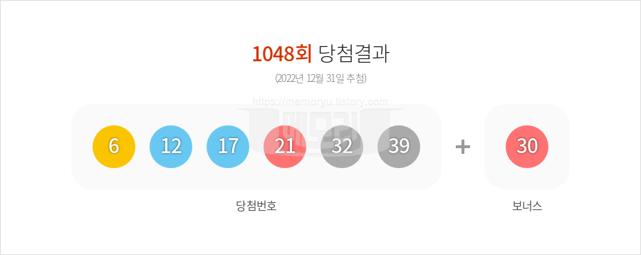 (주)동행복권에서 시행하는 로또 6/45 1048회(2022년 12월 31일 추첨)의 당첨 결과(복권 총 판매액과 등위별 당첨금액, 1등 당첨자 배출 판매점 등)가 나왔습니다. 1048회 로또복권 총 판매액은 117,323,901,000원입니다. 행운의 로또 1등 당첨 번호는 6, 12, 17, 21, 32, 39 입니다. 2등 보너스 번호는 30입니다. 당첨 되신 분들 정말 정말 축하합니다. 당첨금이 3억원을 초과하는 1등의 경우 33%의 세금을 공제하고 당첨금을 지급합니다. 2등과 3등은 보통 3억이 넘지 않기 때문에 22%의 새금이 매겨집니다. 4등과 5등은 당첨금이 5만원 이하 이기에 세금을 부과하지 않고 당첨금을 모두 받을 수 있습니다.