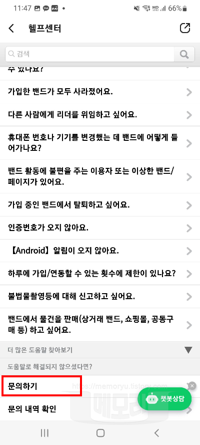 5. 화면 하단으로 화면을 내리면 문의하기가 보입니다. 문의하기를 선택합니다.