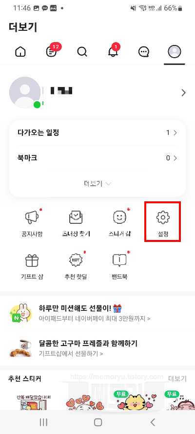 2. 프로필 화면에 중간쯤 보면 메뉴 아이콘이 여러개 보입니다. 이 중에 설정이 있어요. 설정을 선택합니다.