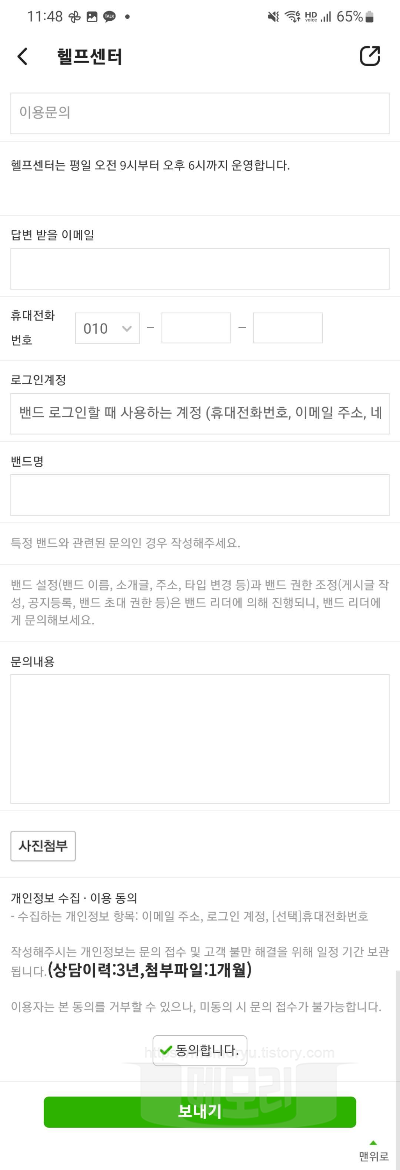 7. 문의 유형을 선택하면, 이제 간단한 개인정보를 입력 후 문의 내용을 입력합니다. 필요한 경우 사진 등 자료를 첨부합니다. 모든 문의 내용을 입력했다면 가장 하단에 보내기 버튼을 누릅니다.