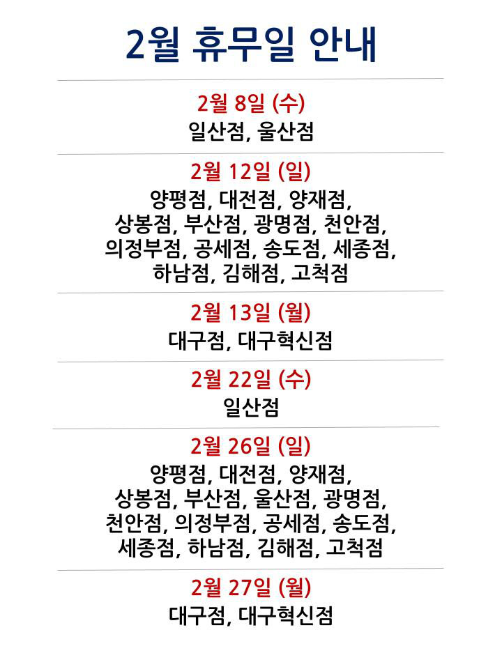 양평점, 대전점, 양재점, 상봉점, 부산점, 울산점, 광명점, 천안점, 의정부점, 공세점, 송도점, 세종점, 하남점, 김해점, 고척점