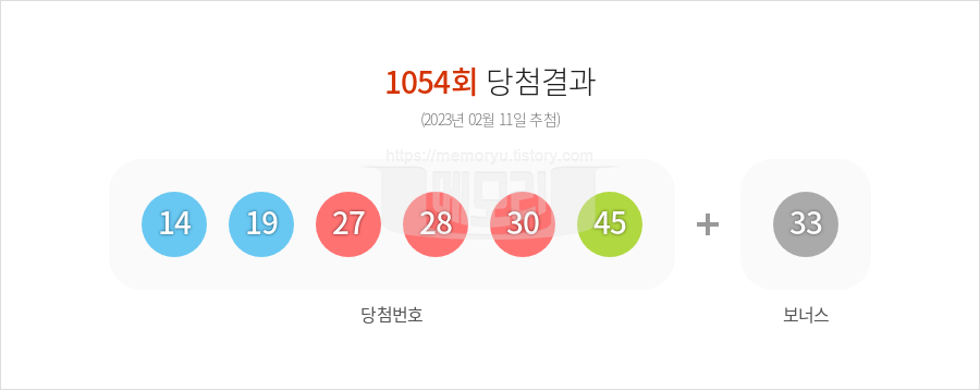 (주)동행복권에서 시행하는 로또 6/45 1054회(2023년 02월 11일 추첨)의 당첨 결과(복권 총 판매액과 등위별 당첨금액, 1등 당첨자 배출 판매점 등)가 나왔습니다. 1054회 로또복권 총 판매액은 113,660,567,000원입니다. 행운의 로또 1등 당첨 번호는 14, 19, 27, 28, 30, 45 입니다. 2등 보너스 번호는 33입니다. 당첨 되신 분들 정말 정말 축하합니다. 당첨금이 3억원을 초과하는 1등의 경우 33%의 세금을 공제하고 당첨금을 지급합니다. 2등과 3등은 보통 3억이 넘지 않기 때문에 22%의 새금이 매겨집니다. 4등과 5등은 당첨금이 5만원 이하 이기에 세금을 부과하지 않고 당첨금을 모두 받을 수 있습니다.