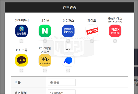 신한인증서, 네이버, 삼성패스, 페이코, 통신사패스, 카카오톡, KB모바일인증서, 토스 등의 간편(민간)인증서 이용을 추천합니다. 간단히 이름과 생년월일, 휴대전화번호 등을 입력 후, 모바일기기에 설치된 인증서로 인증을 거치면 로그인이 진행됩니다.