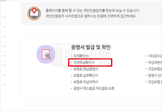 자격득실확인서 발급이 가장 많은 민원중 하나이기 때문에 홈페이지에서 가장 눈에 띄는 자리에 간편 메뉴로 자격득실확인서 발급이 있습니다. 이 메뉴를 눌러 발급 페이지로 이동해도 됩니다. 단, 언제든 첫화면이 바뀔 수 있기에 정확한 경로를 추가로 소개하도록 하겠습니다.