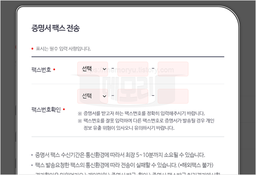팩스 전송으로 확인서를 발급받을 때에는 팩스 전송 버튼을 누른 후, 전송 받을 팩스 번호를 입력합니다. 정확도를 위해 두번 입력합니다. 이후 전송하기 버튼을 누르면 팩스 전송이 됩니다. 팩스 전송까지는 최대 10분 정도 시간이 소요됩니다.