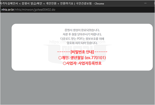 프린트 발급 버튼을 누르면 PDF파일이 다운됩니다. 개인정보 보호를 위해 암호화 처리가 되어 있습니다. 비밀번호는 개인의 경우 생년월일, 사업자의 경우 사업자등록번호입니다.