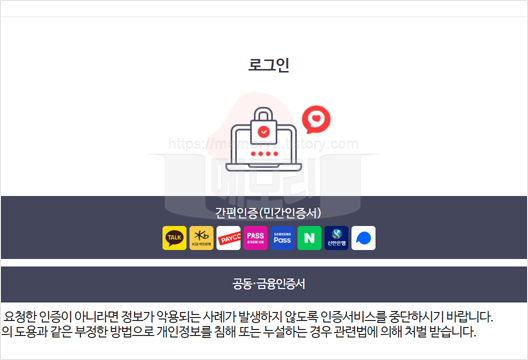 신한인증서, 네이버, 삼성패스, 페이코, 통신사패스, 카카오톡, KB모바일인증서, 토스 등의 간편(민간)인증서 이용을 추천합니다. 간단히 이름과 생년월일, 휴대전화번호 등을 입력 후, 모바일기기에 설치된 인증서로 인증을 거치면 로그인이 진행됩니다.