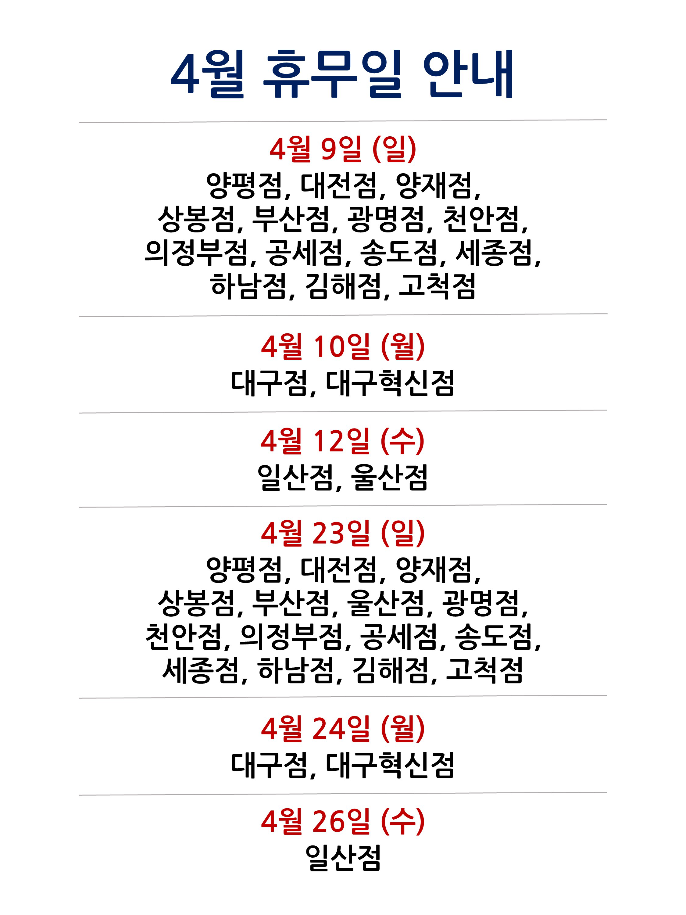 양평점, 대전점, 양재점, 상봉점, 부산점, 울산점, 광명점, 천안점, 의정부점, 공세점, 송도점, 세종점, 하남점, 김해점, 고척점