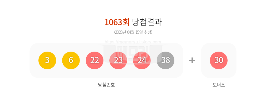 (주)동행복권에서 시행하는 로또 6/45 1063회(2023년 04월 15일 추첨)의 당첨 결과(복권 총 판매액과 등위별 당첨금액, 1등 당첨자 배출 판매점 등)가 나왔습니다. 1063회 로또복권 총 판매액은 108,347,135,000원입니다. 행운의 로또 1등 당첨 번호는 3, 6, 22, 23, 24, 38 입니다. 2등 보너스 번호는 30입니다. 당첨 되신 분들 정말 정말 축하합니다. 당첨금이 3억원을 초과하는 1등의 경우 33%의 세금을 공제하고 당첨금을 지급합니다. 2등과 3등은 보통 3억이 넘지 않기 때문에 22%의 새금이 매겨집니다. 4등과 5등은 당첨금이 5만원 이하 이기에 세금을 부과하지 않고 당첨금을 모두 받을 수 있습니다.