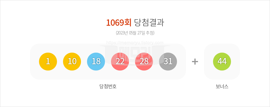 (주)동행복권에서 시행하는 로또 6/45 1069회(2023년 05월 27일 추첨)의 당첨 결과(복권 총 판매액과 등위별 당첨금액, 1등 당첨자 배출 판매점 등)가 나왔습니다. 1069회 로또복권 총 판매액은 108,388,892,000원입니다. 행운의 로또 1등 당첨 번호는 1, 10, 18, 22, 28, 31 입니다. 2등 보너스 번호는 44입니다. 당첨 되신 분들 정말 정말 축하합니다. 당첨금이 3억원을 초과하는 1등의 경우 33%의 세금을 공제하고 당첨금을 지급합니다. 2등과 3등은 보통 3억이 넘지 않기 때문에 22%의 새금이 매겨집니다. 4등과 5등은 당첨금이 5만원 이하 이기에 세금을 부과하지 않고 당첨금을 모두 받을 수 있습니다.