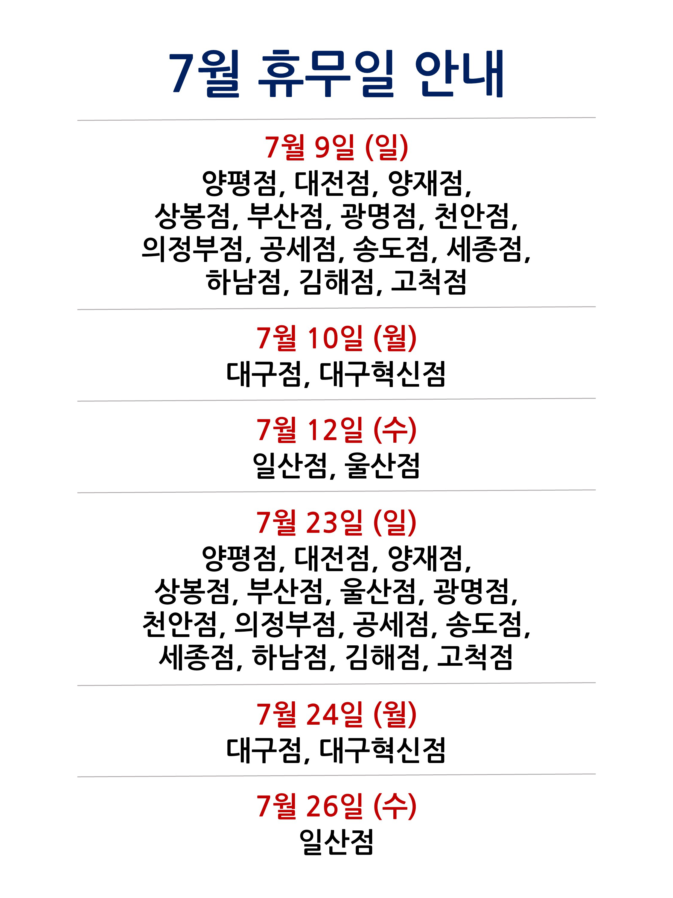 양평점, 대전점, 양재점, 상봉점, 부산점, 울산점, 광명점, 천안점, 의정부점, 공세점, 송도점, 세종점, 하남점, 김해점, 고척점