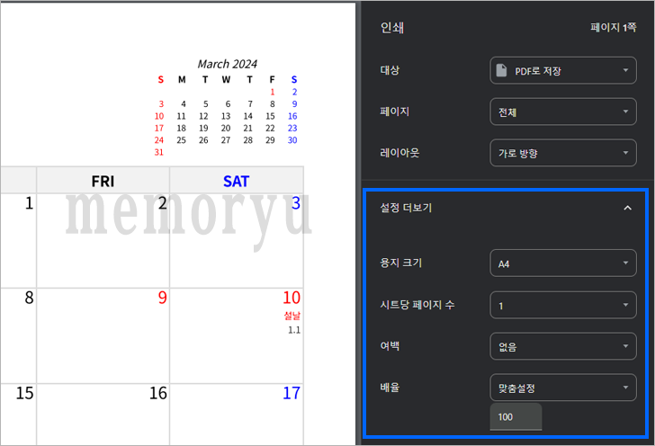 달력 화면의 하단에 있는 '인쇄' 버튼을 클릭하면 인쇄 설정을 위한 대화상자가 나타납니다. 이 대화상자에서는 여백 설정을 '없음'으로 조정해야 합니다. 이러한 설정을 통해 달력을 출력하거나 PDF로 저장할 때, 디자인이 의도한 대로 정확하게 나타나게 됩니다.
