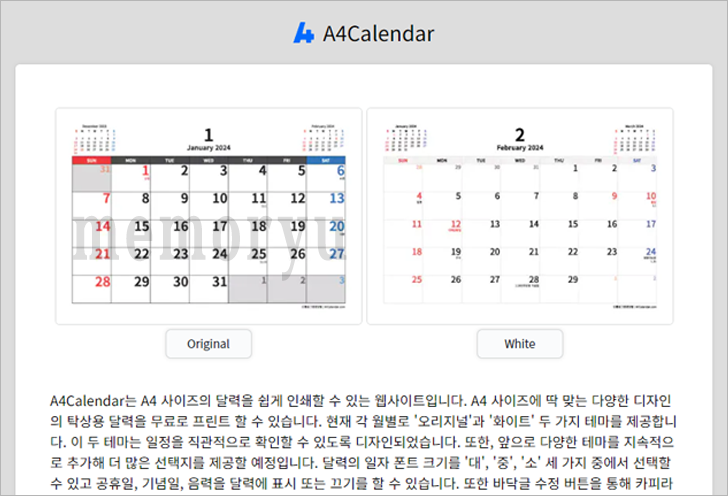이 사이트를 통해 누구나 쉽게 원하는 디자인과 포맷의 탁상 달력을 집이나 사무실의 프린터로 직접 출력할 수 있습니다. 이제 달력을 구하기 위해 지인을 찾거나 중고 시장을 뒤지는 번거로움을 겪지 않아도 됩니다. a4calendar.com을 방문해보세요. 여러분의 일상과 업무에 조금 더 편리함을 더할 수 있을 것입니다.