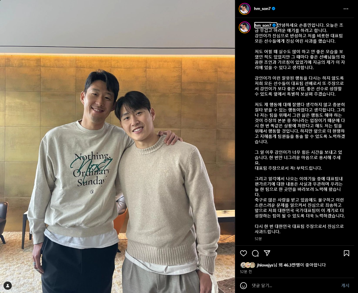 이하 내용은 인스타그램에 이강인이 직접 올린 사과문과 손홍민이 이강인의 사과 후 올린 내용 원문입니다.
