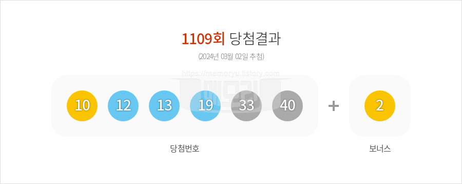 (주)동행복권에서 시행하는 로또 6/45 1109회(2024년 03월 02일 추첨)의 당첨 결과(복권 총 판매액과 등위별 당첨금액, 1등 당첨자 배출 판매점 등)가 나왔습니다. 1109회 로또복권 총 판매액은 117,196,327,000원입니다. 행운의 로또 1등 당첨 번호는 10, 12, 13, 19, 33, 40 입니다. 2등 보너스 번호는 2입니다. 당첨 되신 분들 정말 정말 축하합니다. 당첨금이 3억원을 초과하는 1등의 경우 33%의 세금을 공제하고 당첨금을 지급합니다. 2등과 3등은 보통 3억이 넘지 않기 때문에 22%의 새금이 매겨집니다. 4등과 5등은 당첨금이 5만원 이하 이기에 세금을 부과하지 않고 당첨금을 모두 받을 수 있습니다.