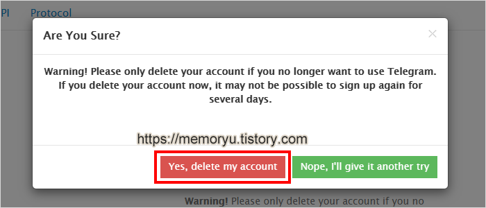마지막으로 확인 창이 한 번 더 뜹니다. 내용은 이전 내용과 비슷합니다. Yes, delete my account를 눌르면 완전히 계정 삭제가 됩니다. 위에서 적었던 것처럼, 계정을 삭제하면 동일 휴대전화 번호로 한 동안 가입이 제한이 됩니다. 그리고 대화내용이러던지 가입했던 채널이나 만들었던 채널이 모두 사라집니다. 복구가 불가능합니다. 가입 제한 기간이 지나서 다 시 가입하면 이전 기록은 모두 사라지고 처음 사용하는 것과 같이 됩니다.