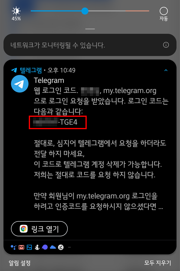 그러면 스마트폰 앱으로 웹로그인 코드가 전송이 됩니다. 로그인 코드를 복사해서 코드 확인 칸에 붙여넣기를 합니다.
