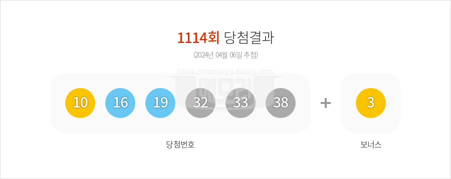 (주)동행복권에서 시행하는 로또 6/45 1114회(2024년 04월 06일 추첨)의 당첨 결과(복권 총 판매액과 등위별 당첨금액, 1등 당첨자 배출 판매점 등)가 나왔습니다. 1114회 로또복권 총 판매액은 113,597,890,000원입니다. 행운의 로또 1등 당첨 번호는 10, 16, 19, 32, 33, 38 입니다. 2등 보너스 번호는 3입니다. 당첨 되신 분들 정말 정말 축하합니다. 당첨금이 3억원을 초과하는 1등의 경우 33%의 세금을 공제하고 당첨금을 지급합니다. 2등과 3등은 보통 3억이 넘지 않기 때문에 22%의 새금이 매겨집니다. 4등과 5등은 당첨금이 5만원 이하 이기에 세금을 부과하지 않고 당첨금을 모두 받을 수 있습니다.