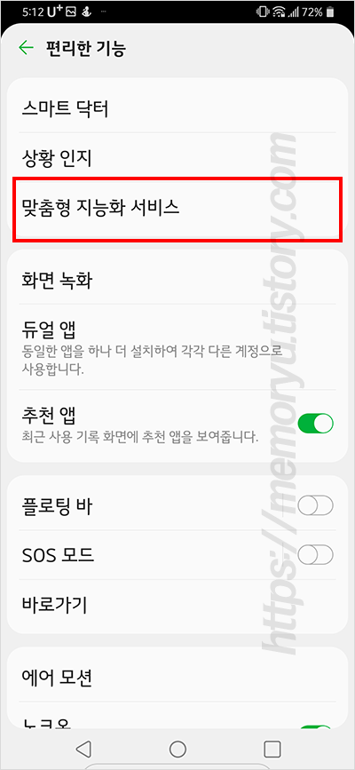 편리한 기능 화면으로 이동하면, "맞춤형 지능화 서비스"라는 항목을 찾을 수 있습니다. 이 것을 터치해 들어갑니다.