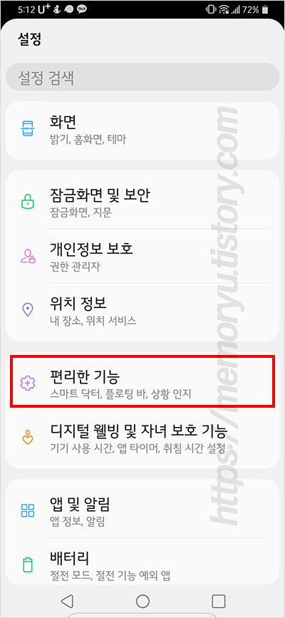 LG 스마트폰의 설정화면으로 이동합니다. 설정 메인화면에서 스크롤을 조금 내리면 "편리한 기능"이라는 메뉴가 보입니다. 해당 메뉴를 터치해 상세화면으로 이동합니다.