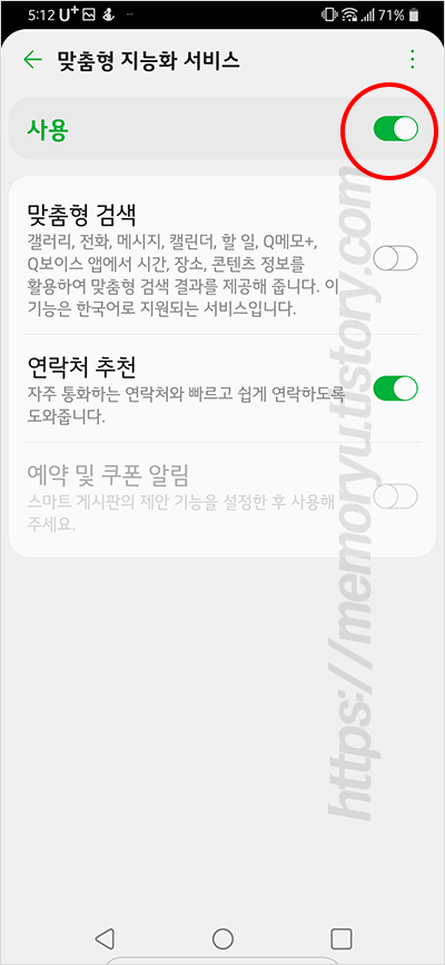 옵션 - 편리한 기능 - 맞춤형 지능화 서비스 - 끄기