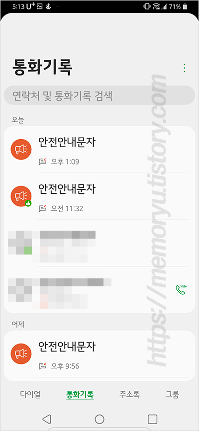 맞춤형 지능화 서비스를 사용안함을 해주면 통화기록에서 더 이상 연락처 추천이 뜨지 않습니다. 아래는 맞춤형 지능화 서비스를 끄기전, 후를 비포 에프터로 비교한 이미지입니다.