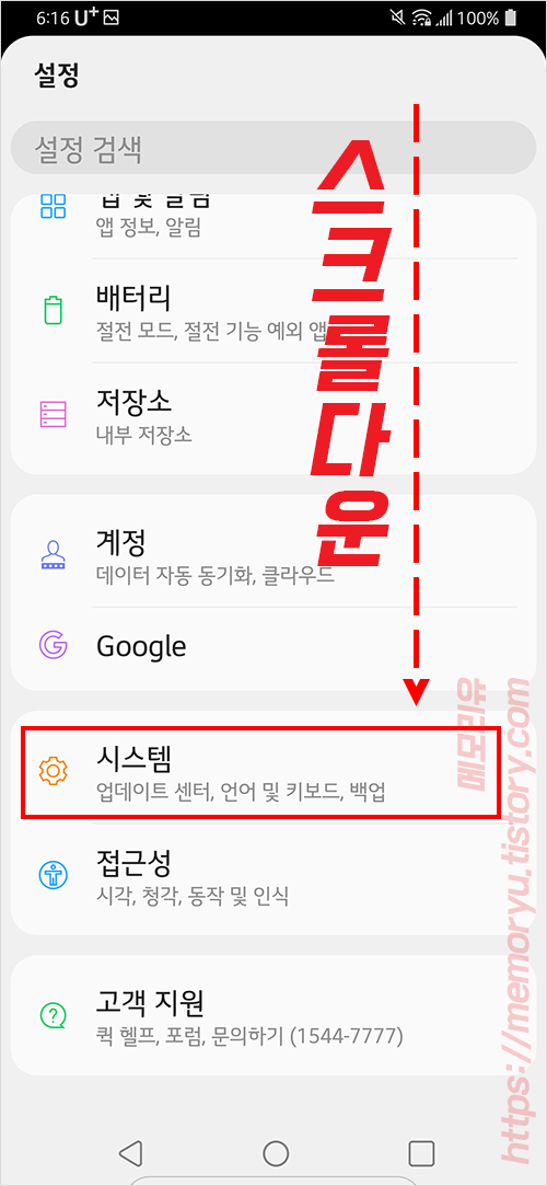 설정화면에서 스크롤을 하단으로 내려줍니다. 가장 아랫 부분에 시스템 메뉴가 있습니다. 시스템 메뉴를 선택해줍니다.