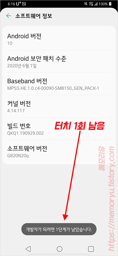 소프트웨어 정보에 빌드 번호가 보입니다. 빌드번호를 위에서 말한 것처럼 7회를 연속해서 터치해줍니다.