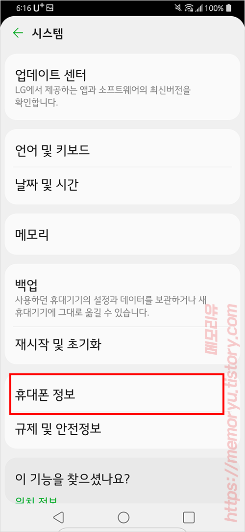 휴대폰 정보에 들어가 스크롤을 내리면 중간부분에 소프트웨어 정보 메뉴가 있습니다. 소프트웨어 정보를 선택해줍니다.