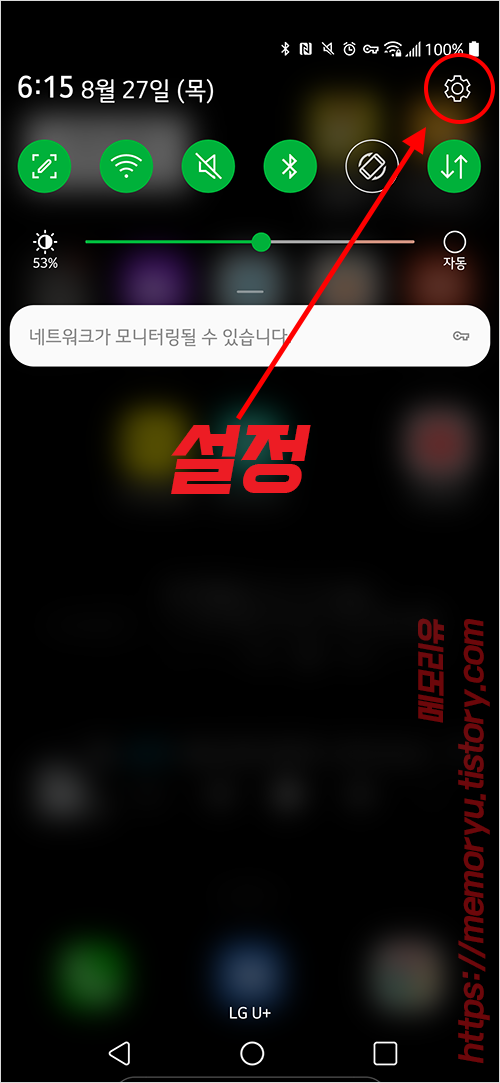 스마프폰의 설정으로 이동합니다. 상단바를 내리면 톱니바퀴 모양이 있습니다. 톱니바퀴 모양의 아이콘을 누르면 설정으로 진입합니다.