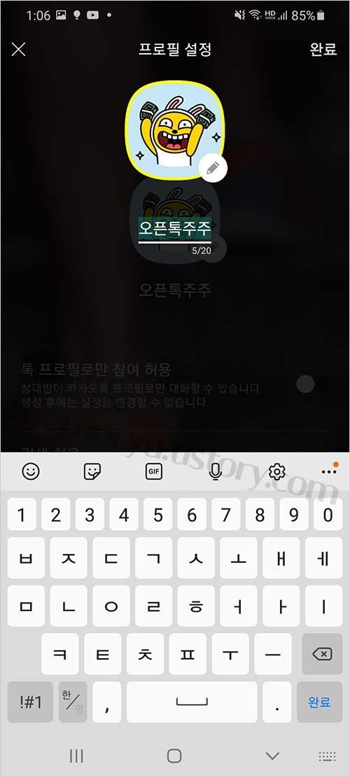 다음은 채팅방 개설자(방장)의 프로필을 설정하는 단계입니다. 카카오톡 본 계정 프로필을 그대로 사용해도 되고 위와 같이 익명의 프로필 계정을 만들어 사용해도 됩니다.