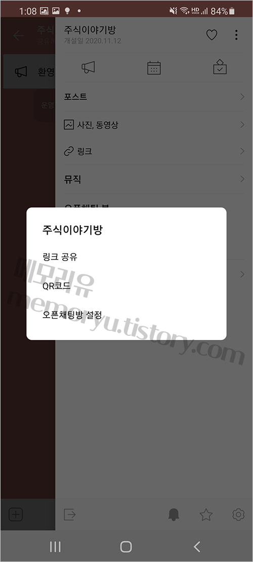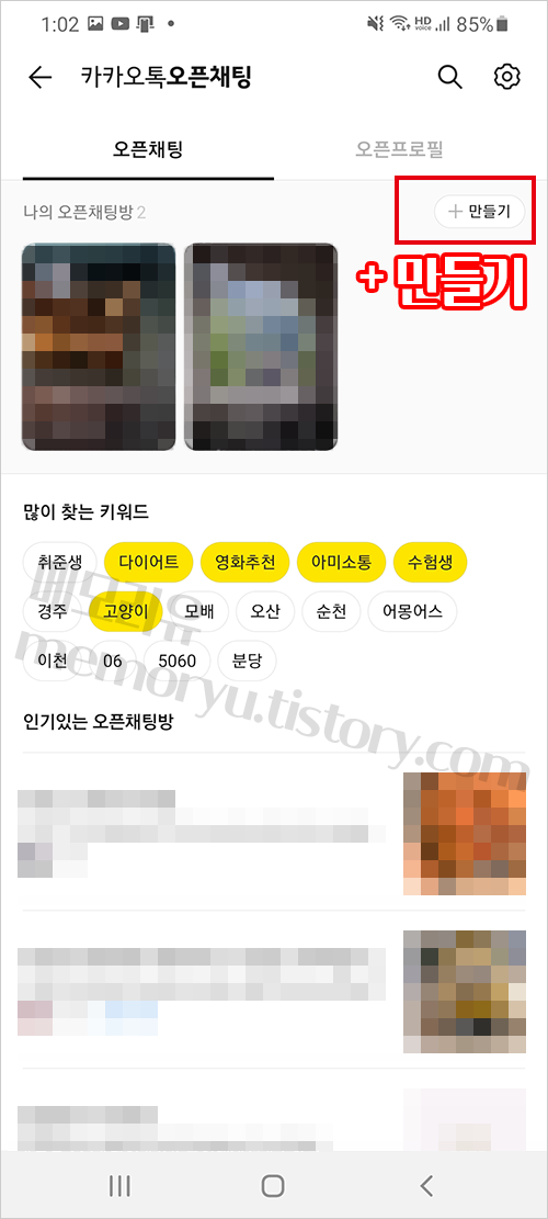 자 이제 오픈채팅방이 만들어 졌습니다. 가만히 기다리면 누군가 검색해서 들어옵니다. 더 빠른 대화상대를 모집하기 위해서는 홍보가 필요합니다. 우측 상단에 삼줄 아이콘을 눌러 오픈채팅방 탭 메뉴를 불러옵니다.