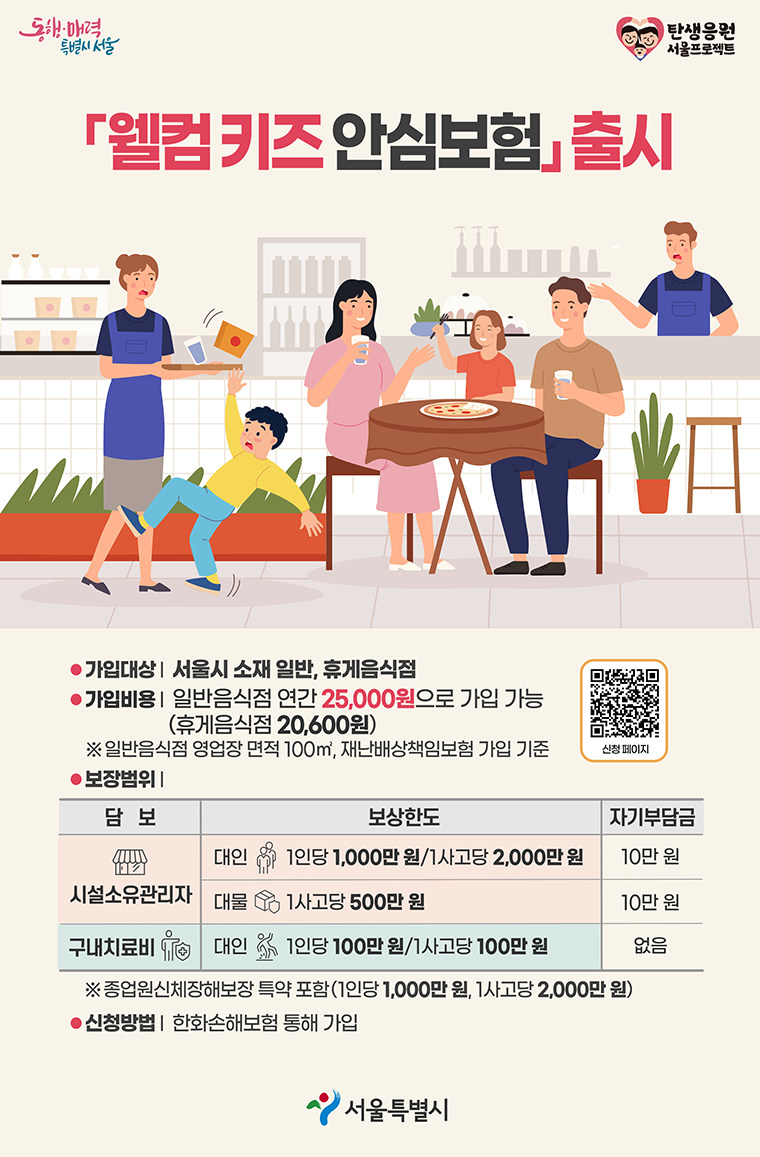 '웰컴키즈 안심보험'은 서울시와 한화손해보험이 함께 개발한 상품으로, 식당이나 카페에서 발생할 수 있는 안전사고에 대해 1사고당 최대 2천만 원까지 보장해줍니다. 이는 전국 최초로 시행되는 정책으로, 7월 29일부터 서울 소재 음식점과 카페 영업주들의 가입 신청을 받고 있습니다.