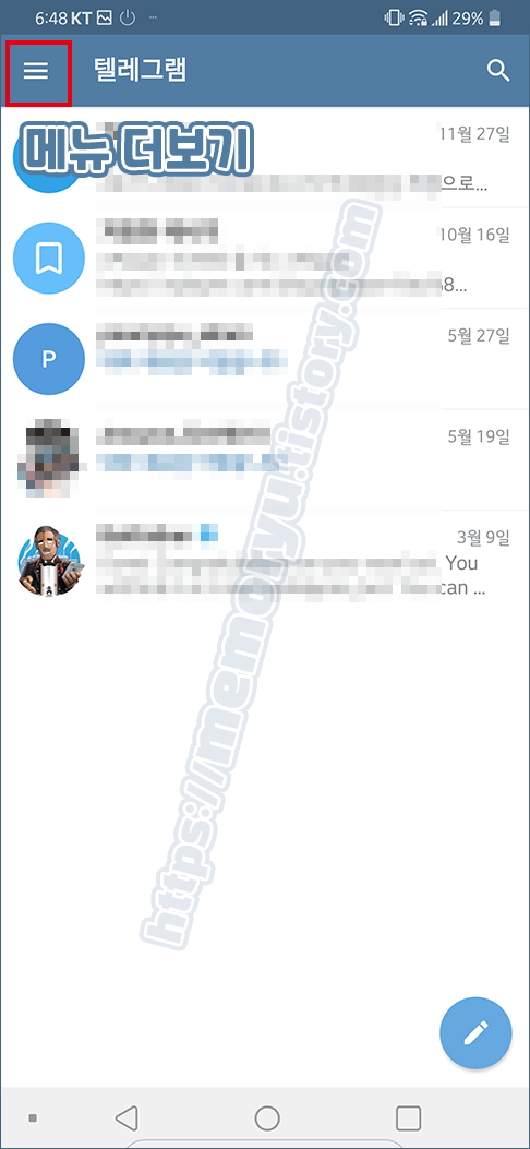 대화목록 화면에서 왼쪽 윗부분에 보면, 더보기 아이콘이 있습니다. 메뉴 더보기 아이콘을 터치해서 메뉴를 불러옵니다.