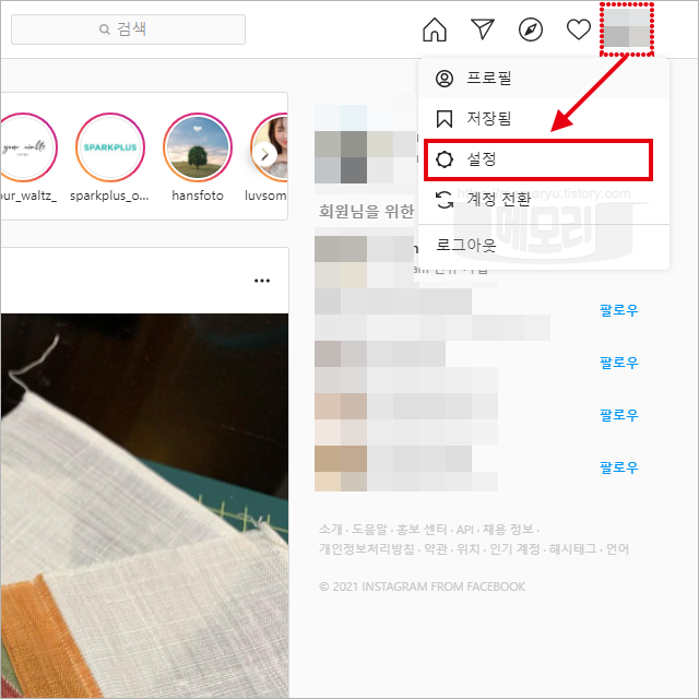 인스타그램 웹사이트에 로그인을 하고 메인화면에 진입하면, 오른쪽 상단부분에 계정 프로필 이미지가 조그만하게 있습니다. 이 부분을 클릭하면 계정 메뉴가 나타납니다. 메뉴 목록에서 설정을 눌러 인스타그램 계정 설정으로 들어갑니다.
