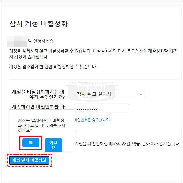 비활성화 이유를 선택하고 계정 비밀번호를 입력하면 계정 일시 비활성화 버튼이 활성화 됩니다. 이 버튼을 눌러 최종적으로 계정 비활성화를 묻는 대화창에 예를 눌러 주면 계정이 일시적으로 비활성화가 됩니다. 비활성화가 되면 다른 사람들이 계정을 해도 검색이 되지 않습니다. 계정에 올린 사진이나 글 등을 조회가 되지 않습니다. 마치 없는 계정, 삭제된 계정 같습니다. 하지만 계정과 계정의 내용은 보이지만 않을 뿐 실제로 삭제된 것은 아닙니다.