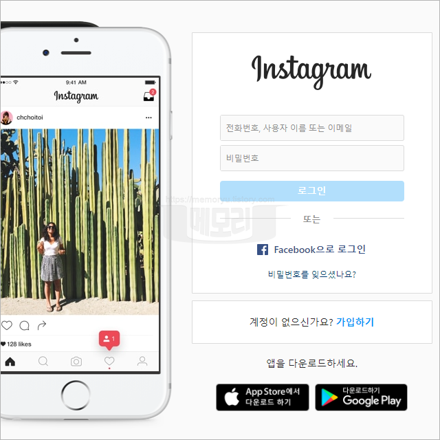 먼저, 인스타그램 사이트에 접속해 계정 로그인을 진행합니다. 스마트폰에서 앱으로 비활성화를 하려고 찾아보니 아무리 해도 "계정을 일시적으로 비활성화" 글씨를 찾을 수가 없었습니다. 이건 아마도 웹사이트에서만 가능한듯합니다.