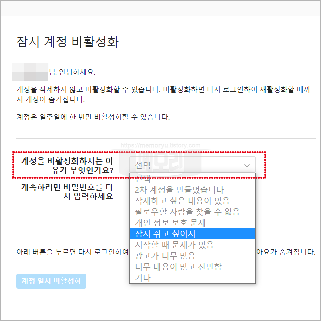 인스타그램 계정 일시 비활성화를 위해서 비활성화 이유를 선택해 주어야 합니다. 드랍 선택지에서 선택해 주면 됩니다.