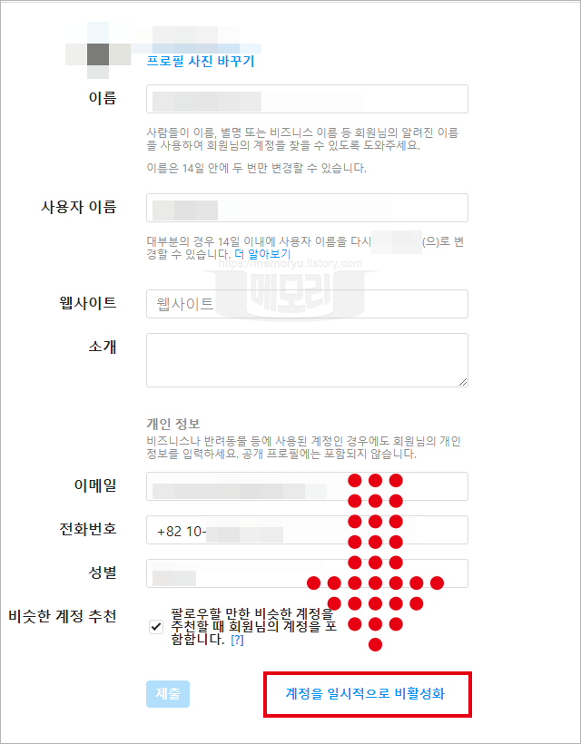 인스타그램 계정 설정화면 입니다. 이름, 사용자 이름, 소개, 이메일, 전화번호 등 계정 정보를 이 곳에서 수정을 할 수 있습니다. 화면 하단 부분에 "계정을 일시적으로 비활성화" 글씨가 파란색으로 보입니다. 이 글씨를 클릭하면 계정 비활성화 설정화면으로 이동합니다.