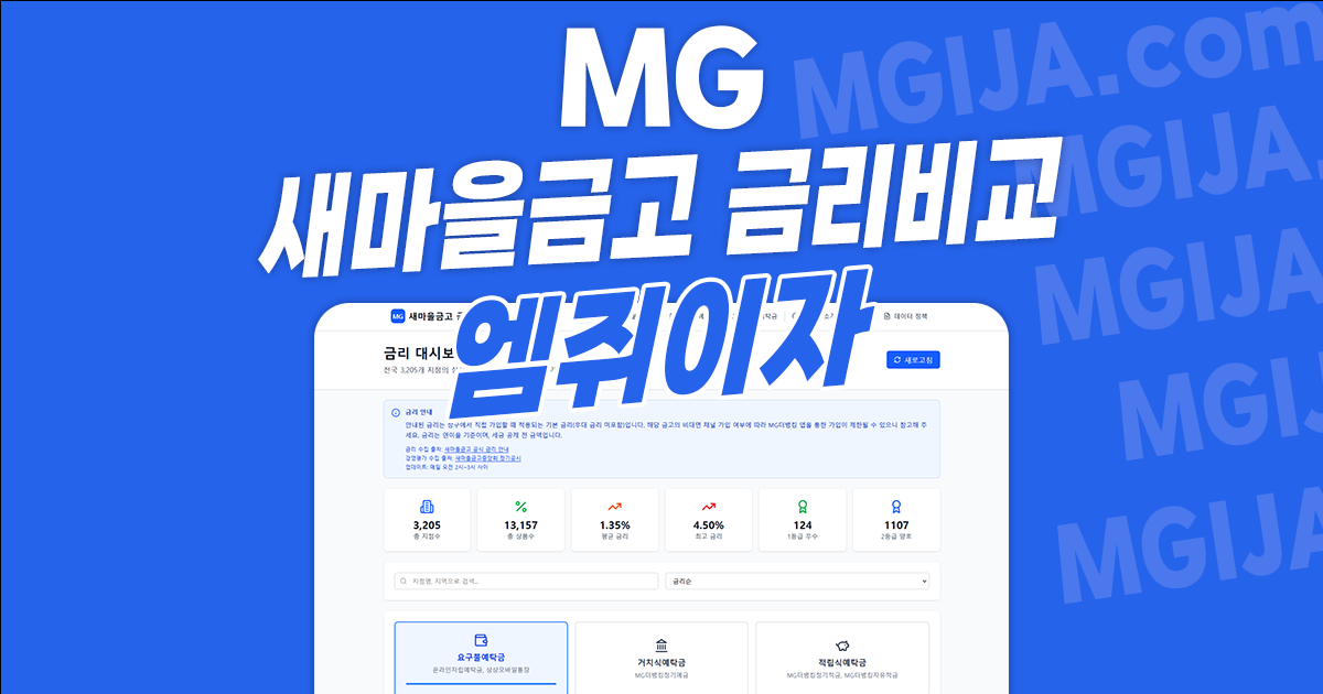 "새마을금고 금리비교"는 전국 3,207개 새마을금고 지점의 예금, 적금 상품 금리를 모아 실시간으로 보여주는 사이트입니다. 매일 업데이트된 정보를 바탕으로 최고 연이율과 우수 지점, 상품 랭킹까지 한 화면에서 확인할 수 있습니다.
