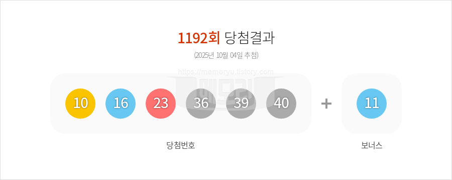 이번 1192회 로또 당첨번호는 10 16 23 36 39 40이며, 보너스 번호는 11입니다. 로또 당첨번호 6개를 모두 맞추시면 1등에 당첨되며, 5개의 번호와 보너스 번호를 맞추시면 2등에 당첨됩니다.