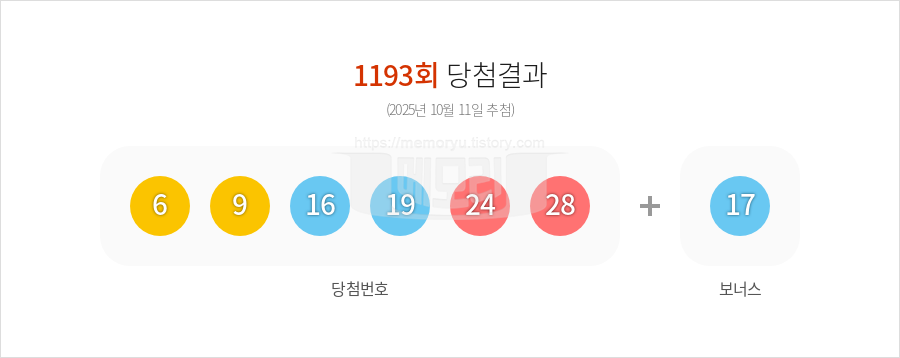 이번 1193회 로또 당첨번호는 6 9 16 19 24 28이며, 보너스 번호는 17입니다. 로또 당첨번호 6개를 모두 맞추시면 1등에 당첨되며, 5개의 번호와 보너스 번호를 맞추시면 2등에 당첨됩니다.