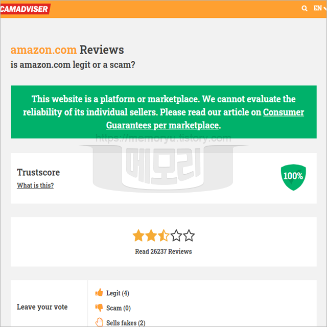 해외 직구시, 모르는 사이트에 접속해서 물건을 구매할 때, 사이트가 사기 사이트인지 의심 뿐만 아니라 검증을 해보는 습관도 필요합니다. 돌다리도 두드리라는 말이 있듯이 여러번 확인을 해야 피해를 막을 수 있습니다. 사이트의 신뢰도, 안정성, 얼마나 오래동안 유지해 왔는지 등 이력을 확인해 볼 수 있는 사이트가 있습니다. 바로 스캠어드바이저라는 웹사이트 입니다. 이 곳에서 도메인 주소를 입력해 조회를 하면 사이트의 기본적인 정보와 신뢰도 등을 평가해 점수를 도식화해 보여줍니다. 물건을 구매하기 전 이 사이트의 평가를 미리 확인해 봄으로써 사기를 미연에 방지할 수 있습니다.
