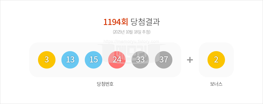 이번 1194회 로또 당첨번호는 3 13 15 24 33 37이며, 보너스 번호는 2입니다. 로또 당첨번호 6개를 모두 맞추시면 1등에 당첨되며, 5개의 번호와 보너스 번호를 맞추시면 2등에 당첨됩니다.