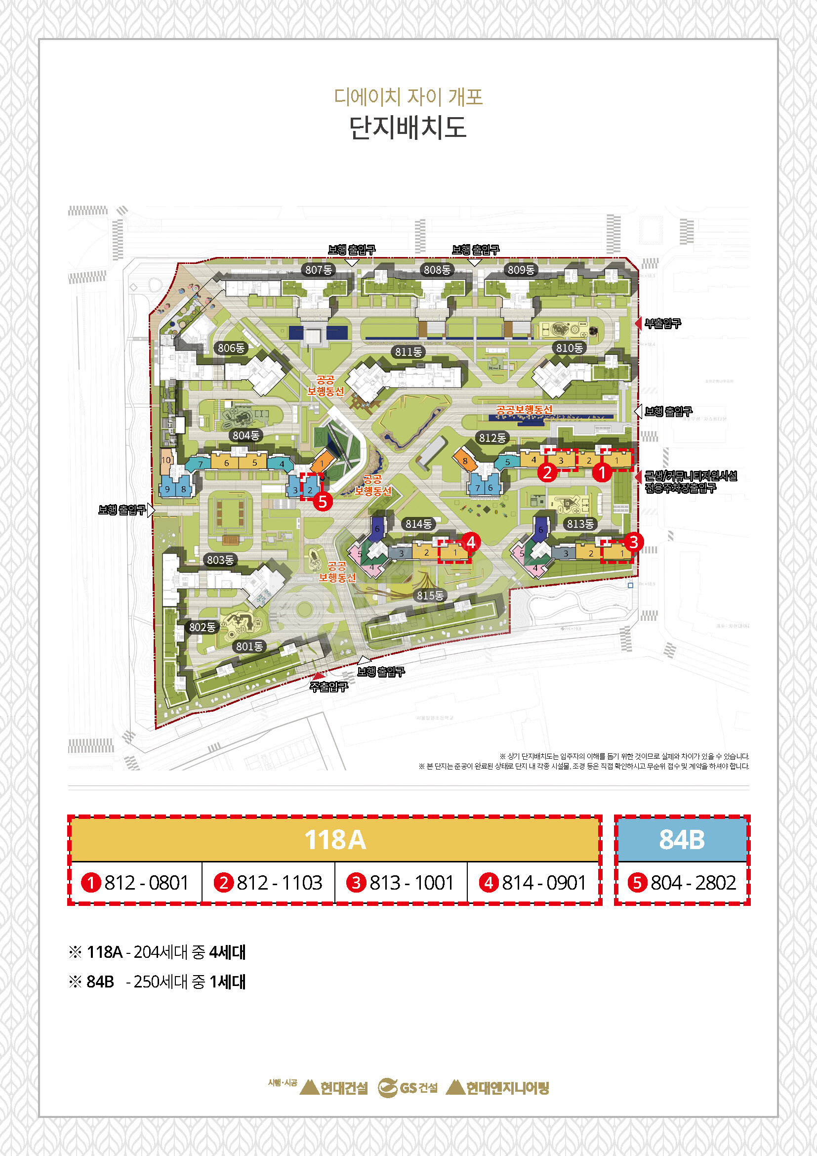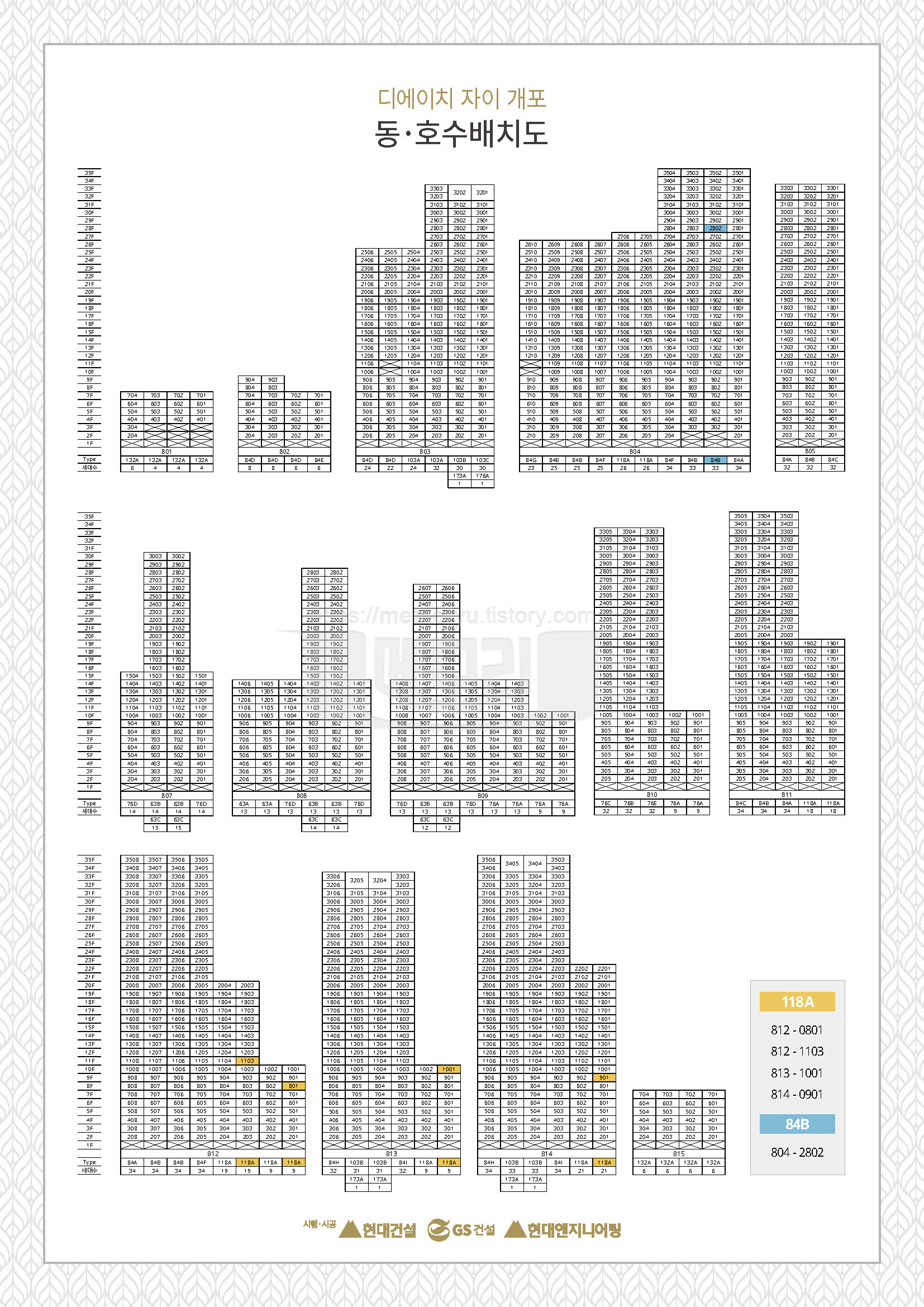단지 배치도를 보면 이른바 로얄동이라 불리는 남쪽에 위치한 동에 118 형이 4세대가 골고루 나와 있습니다. 대부분 8~11층 사이에 위치해 있어 로얄동에 로얄층입니다. 84형의 경우 단지의 정가운데 위치해 있어 외부 소음과 외풍 등 으로부터 강점이 있을 것으로 보입니다. 또 28층이어 고층에서 바라보는 뷰가 인상적일 것으로 예상됩니다.