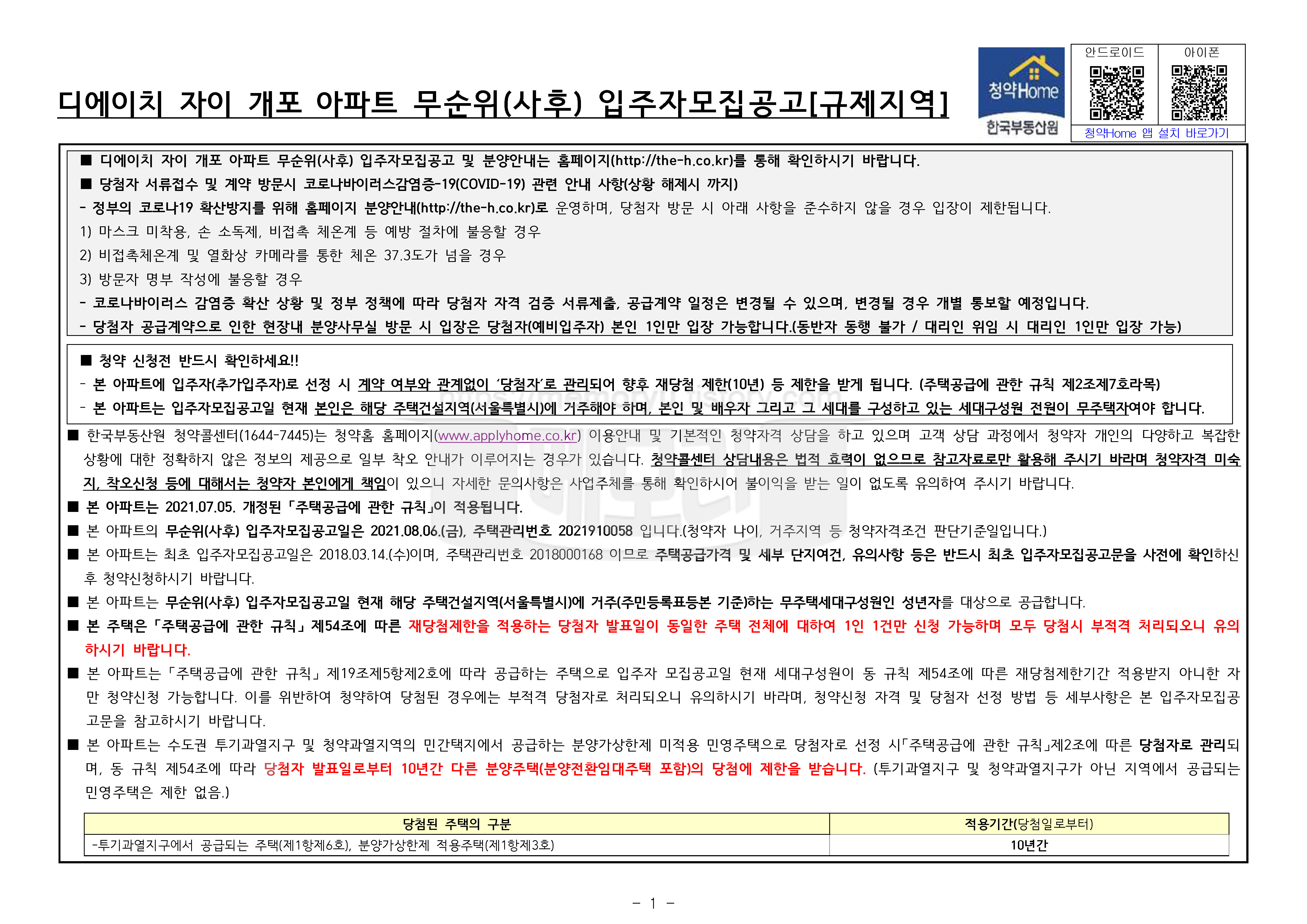 이번 공고와 비슷한 지난해 12월 서울에서 자이아파트 줍줍 이벤트가 있었습니다. 당시 30만 명이 청약에 참여하는 엄청난 열기를 보여줬고 30만 대 1의 경쟁률을 뚫고 당첨된 1순위 당첨자가 계약금 마련을 하지 못해 당첨을 포기하고 2순위 당첨자에게 그 기회가 넘어간 유명한 일화가 있습니다. 청약 참여도 좋지만 계약금 마련 계획도 상당히 중요한 대목입니다. 특히, 이번 청약건의 경우 당첨 후에 10년 동안 재당첨이 제한되기 때문에 더더욱 신중할 필요가 있습니다.