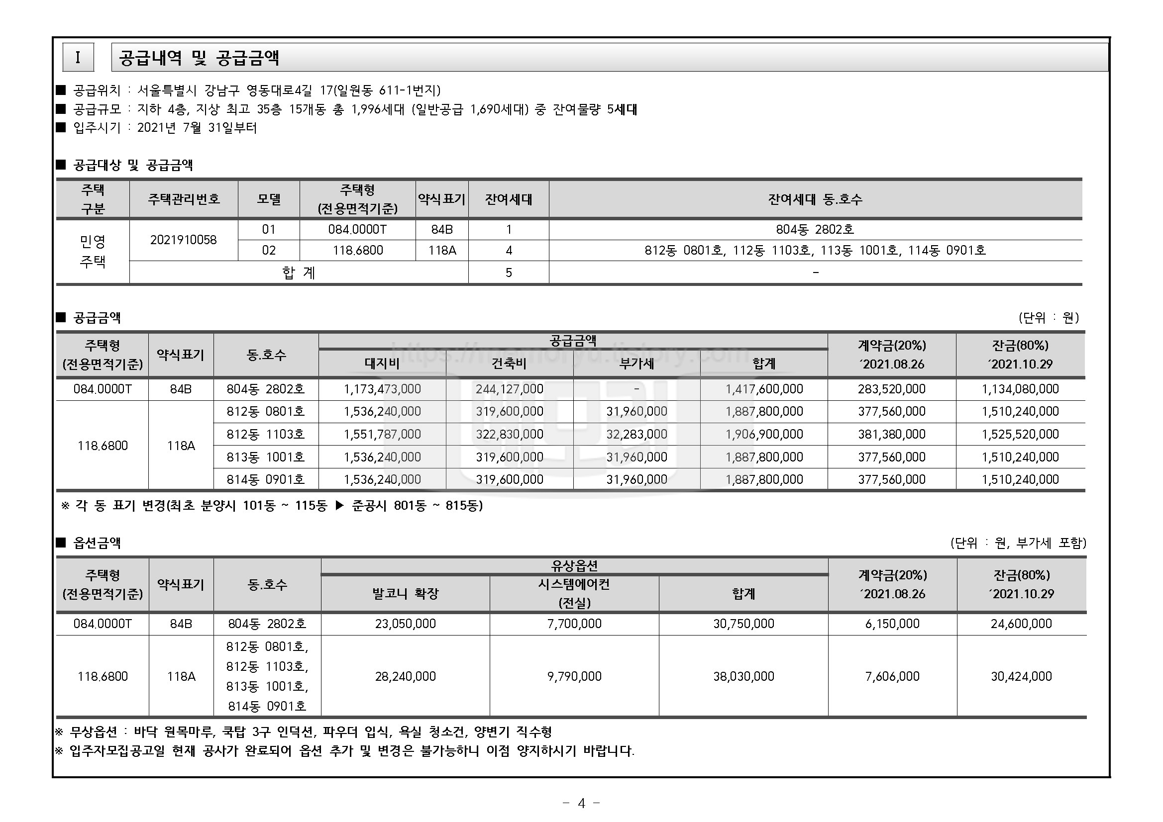 공급가와 옵션금액은 공고문의 내용을 확인바랍니다. 주의할 사항은 당첨 이후 계약시에 아파트 공급가와 유상옵션 비용을 합한 금액의 20%가 준비되어 있어야 한다는 점입니다. 84형의 경우 어림잡아 2억9천만원익고 118형의 경우 약 3억9천만원이 필요합니다. 3~4억을 단 기간에 마련할 수 있는 재원마련 계획을 반드시 세워 계약에 차질없도록 해야 합니다.