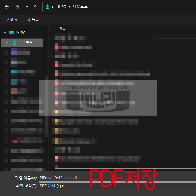PDF로 저장을 누르면 파일탐색화면이 활성화 됩니다. 이곳에서 저장하고자 하는 위치를 정해 저장을 하면 파일이 저장이 됩니다. 저장된 PDF파일은 프린터로 출력도 가능하고 이메일이나 카카오톡 같은 메신저로 공유 및 전송도 할 수 있습니다. 뿐만 아니라 스마트폰으로 보낸 후 모바일팩스앱을 이용해 팩스로도 발송이 가능합니다.