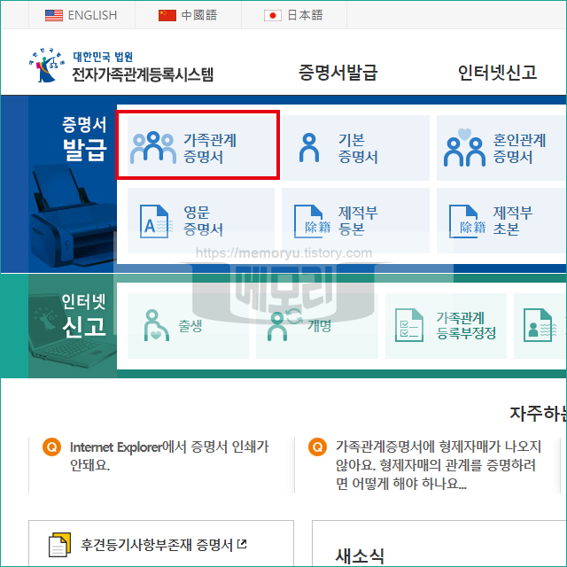 전자가족관계등록시스템에 접속하면 메인화면에서 가족관계증명서를 선택합니다.